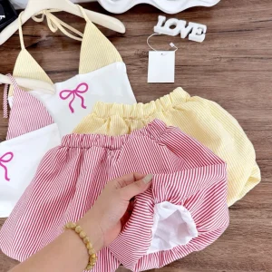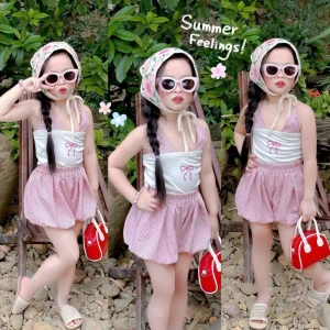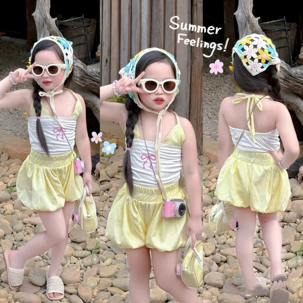 Thiết kế độc đáo: Bộ đồ bơi gồm áo quây bra và quần đùi bí kẻ sọc. Tặng kèm kính, hoàn hảo cho bé đi biển hoặc camping.