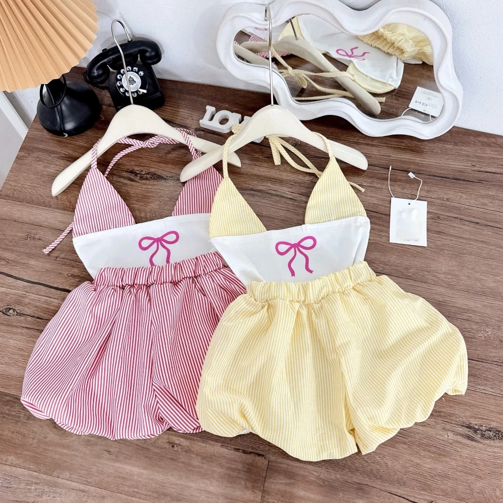 Set áo quây bra, quần đùi bí (tặng khăn turban) kẻ sọc đi biển cho bé